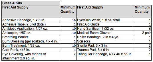 Class A first aid kits are intended to provide a basic range of products to deal with most common types of injuries encountered in the workplace including: major wounds, minor wounds (cuts and abrasions), minor burns and eye injuries. First aid kits designated as Class A shall contain the assortment of compliant supplies in the quantities specified in the table below.