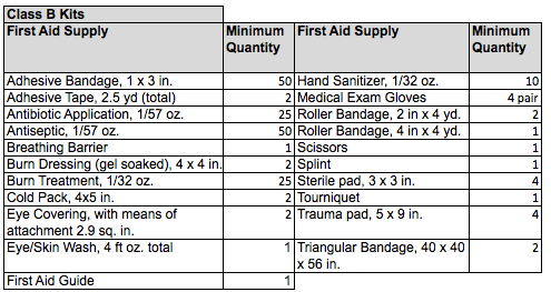 Class B kits are intended to provide a broader range and quantity of supplies to deal with injuries encountered in more populated, complex and/or high risk workplace environments. First aid kits designated as Class B shall contain the assortment of compliant supplies in the quantities specified in the table below.
