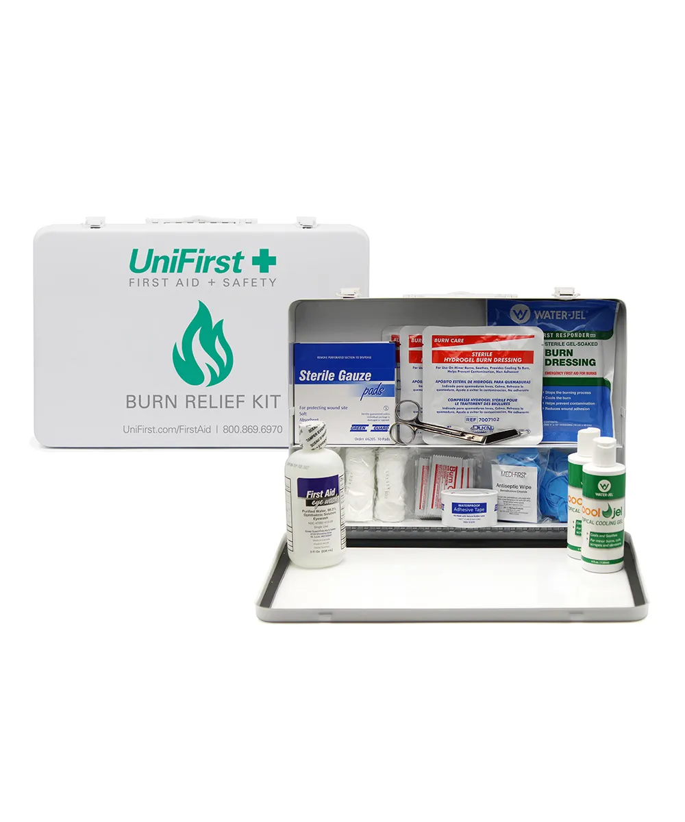 Provides a variety of small and large water-based burn dressings, topical gels, eye wash, and gauze to manage burn injuries on the job.